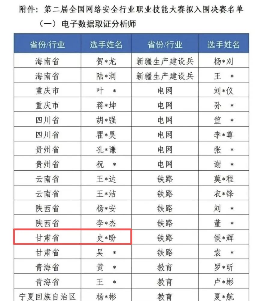 近日,在由公安部、人力资源社会保障部、全国总工会三部委联合主办的第二届全国网络安全行业职业技能比武大赛中,临夏州公安局网安支队一级警员史盼盼 在甘肃赛区电子数据取证分析师赛项中历经多轮激烈角逐,以甘肃赛区第一名成绩入围全国总决赛,荣获由省人社厅授予的“甘肃省技术能手”称号,并在全国决赛中获得优胜奖!