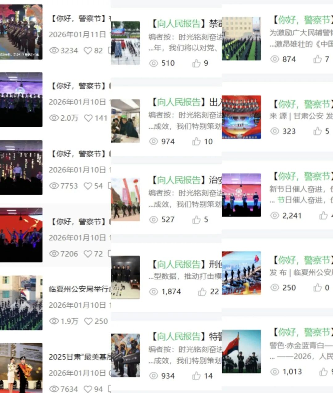 系列活动期间,临夏州公安机关政工部门整合资源,通过全媒体宣传格局,在州局微信公众号、视频号、抖音等各类新媒体开设“向人民报告”“你好,警察节”“读给你听”“临夏公安文联”等专栏,刊发系列庆祝活动新闻稿件97篇,摄制推出主题微视频作品51部,系列海报4篇、摄影书法美术线上展3期;召开警媒座谈会3场次,邀请主流媒体记者随警采访,深入报道活动开展情况,进一步扩大宣传覆盖面。截至目前,临夏州公安机关系列庆祝活动被国家级、省、州级主流媒体转载和发稿60余篇,累计阅读量突破58万余人次,营造了警民同庆、社会共赞的浓厚节日氛围,进一步提升了公安机关的公信力和美誉度。此次庆祝第六个中国人民警察节系列活动,内容丰富、形式多样、成效显著,不仅让全体民辅警感受到了节日的荣耀与温暖,更拉近了警民距离,提升了公安队伍的凝聚力和战斗力。