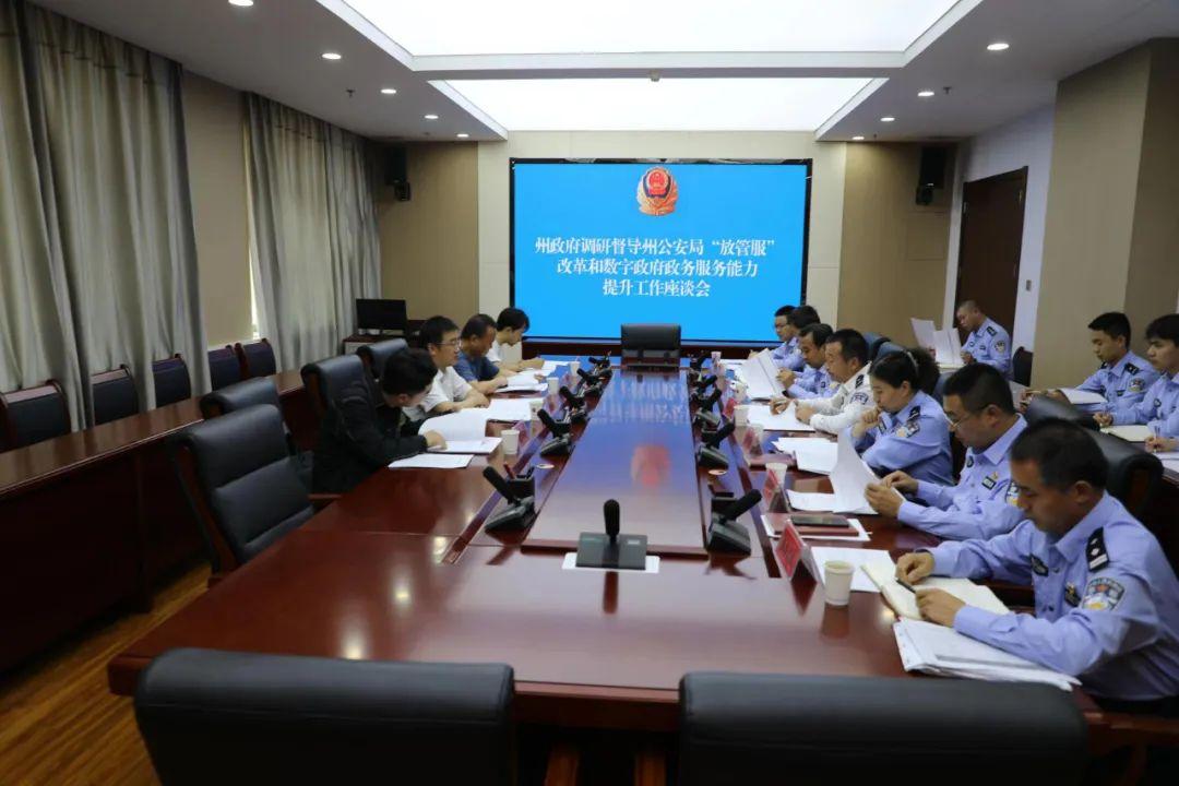 调研组一行先后通过查看资料、听取汇报、座谈交流等方式,详细了解州公安局“放管服”改革及数字政府政务服务能力提升工作开展情况,全面掌握公安“放管服”改革当前存在的问题,对州公安局进一步深化“放管服”改革和数字政府政务服务能力提升提出要求。