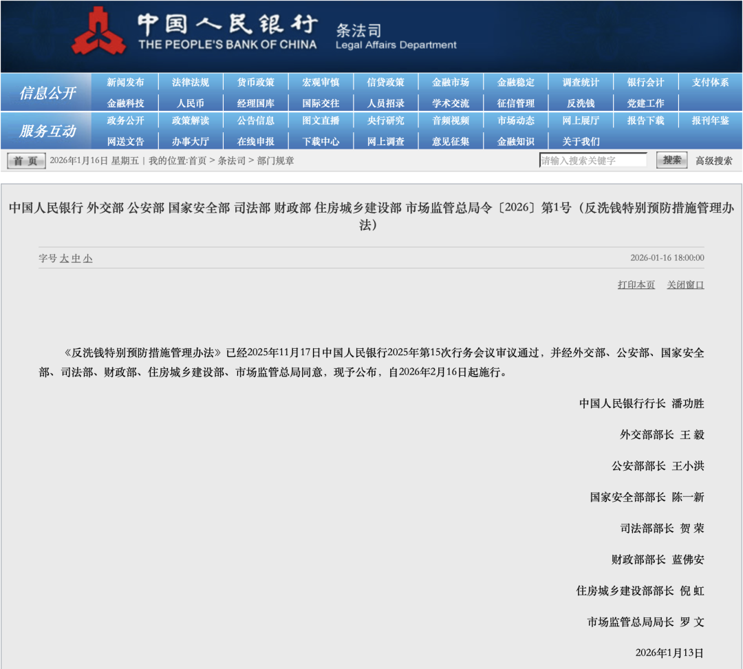 《反洗钱特别预防措施管理办法》已经2025年11月17日中国人民银行2025年第15次行务会议审议通过,并经外交部、公安部、国家安全部、司法部、财政部、住房城乡建设部、市场监管总局同意,现予公布,自2026年2月16日起施行。