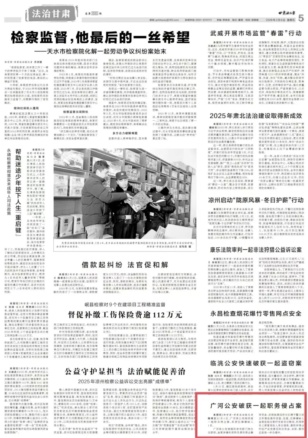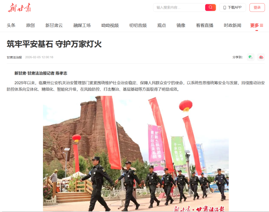 ▲新甘肃刊发《筑牢平安基石守护万家灯火》、《临夏海东两地协作成功营救5名遇险驴友》和广河县公安局《2026年春运启幕广河交管多措并举护航平安返乡路》信息。