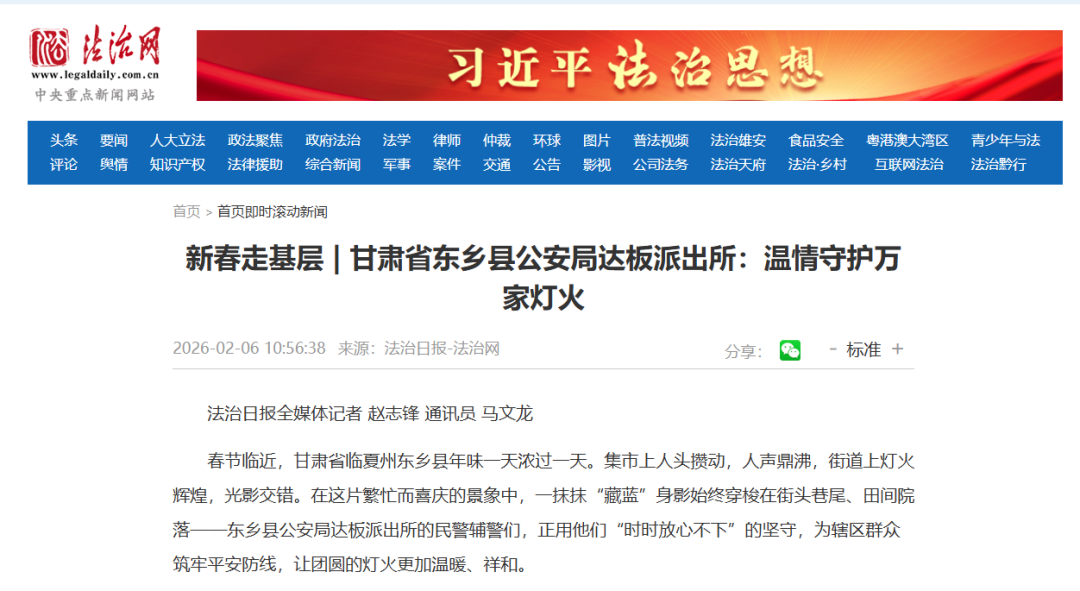 ▲法治网刊发东乡县公安局《新春走基层|甘肃省东乡县公安局达板派出所:温情守护万家灯火》信息。