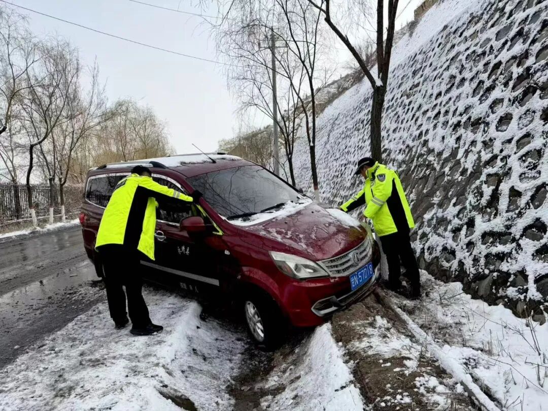 和政县公安局交管大队最大限度地将警力投放到路面,对临水临崖,急弯陡坡路段开展除冰出雪作业和交通劝导。