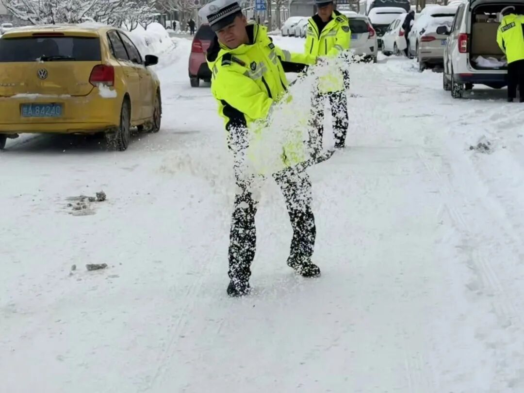 广河县公安局交管大队迅速行动,在城区结冰路段开展除冰除雪、疏堵保畅、巡逻管控工作,守护群众出行平安。