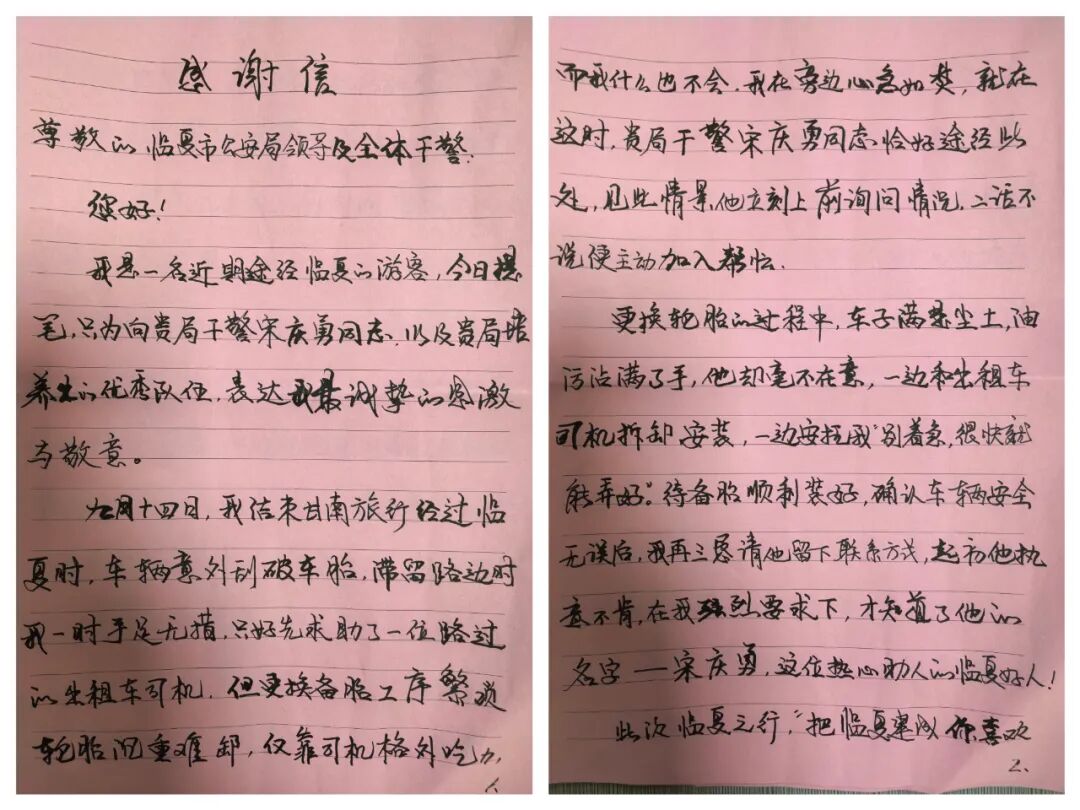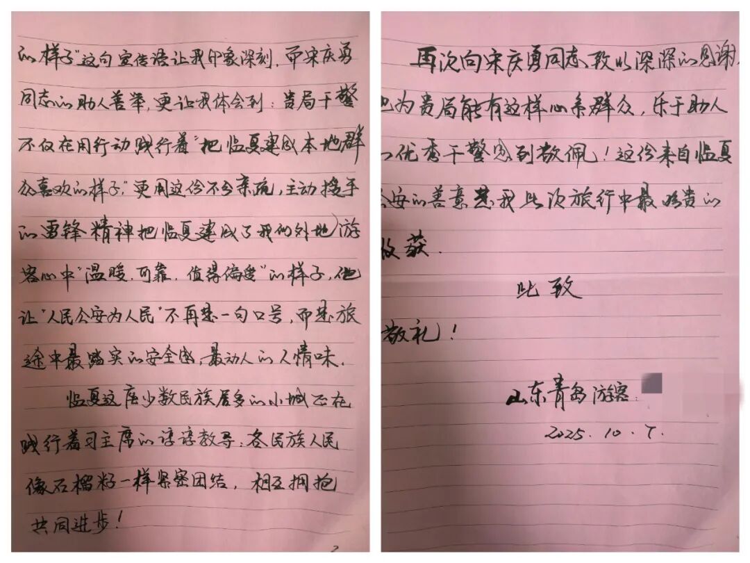 游客返回青岛后,一直记挂着民警的热心帮助。为表谢意,特意制作锦旗、手写感谢信,通过邮寄送达临夏市公安局。10月10日,这份满载感恩的“礼物” 抵达,让全体民辅警倍受鼓舞。