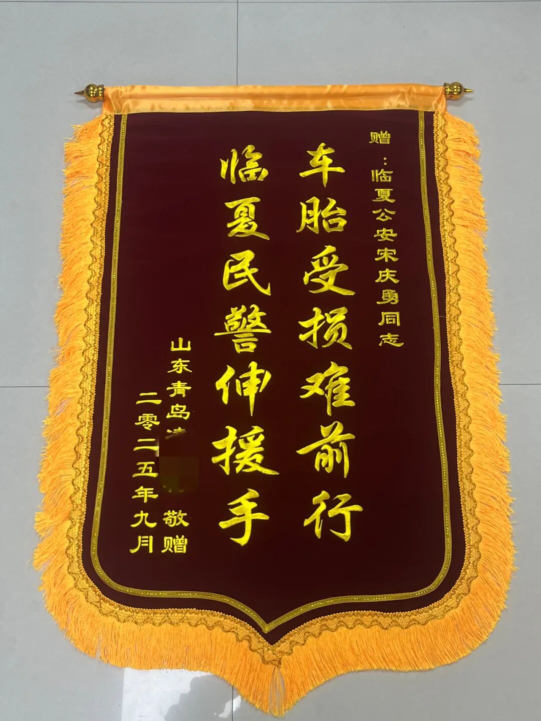 10月10日上午,临夏市公安局收到了一份来自山东青岛的“特殊包裹”,拆开一看是一面印有“车胎受损难前行临夏民警伸援手”的锦旗和一封感谢信,落款是游客凌女士。这面锦旗不仅是一份认可,更是警民鱼水情深的生动见证。