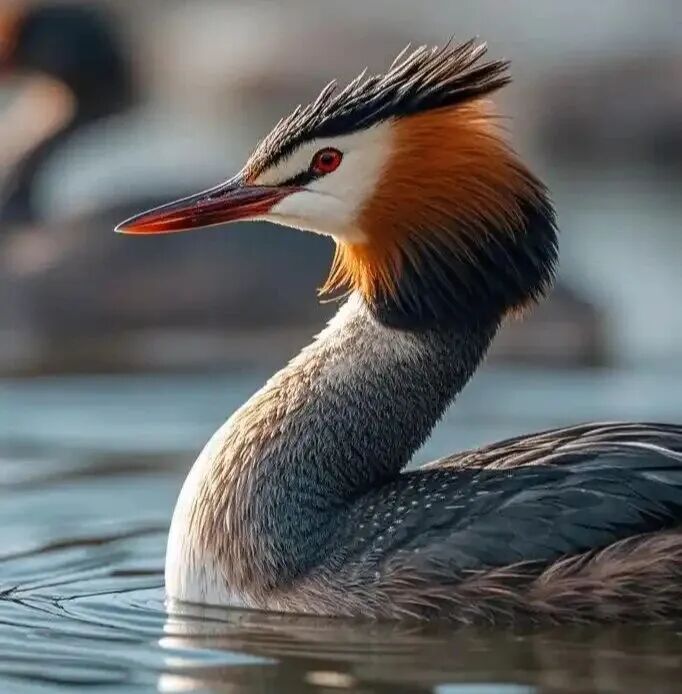 凤头鸊鷉(piti),一种游禽,也是体形最大的一种鸊鷉,雄鸟和雌鸟比较相似,嘴又长又尖,从嘴角到眼睛还长着一条黑线。为国家二级保护动物(来源百度百科)