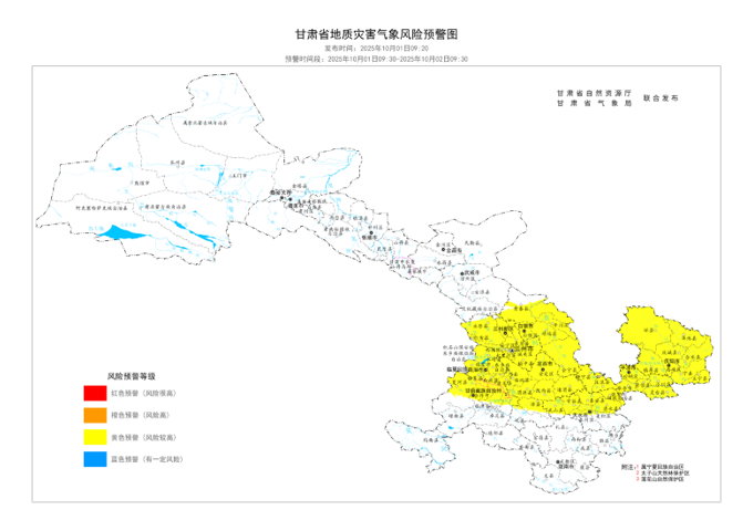甘肃省自然资源厅、甘肃省气象局于2025年10月1日9时20分联合发布地质灾害气象风险预警:10月1日9时30分至10月2日9时30分,甘南藏族自治州(合作市、临潭县、卓尼县、夏河县),庆阳市(西峰区、庆城县、环县、华池县、合水县、正宁县、宁县、镇原县),莲花山风景林保护区,太子山天然林保护区,兰州市(城关区、七里河区、西固区、安宁区、红古区、永登县、皋兰县、榆中县),定西市(安定区、通渭县、陇西县、渭源县、临洮县、漳县、岷县),天水市(秦州区、麦积区、清水县、秦安县、甘谷县、武山县、张家川回族自治县),白银市(白银区、平川区、靖远县、会宁县、景泰县),临夏回族自治州(临夏市、临夏县、康乐县、永靖县、广河县、和政县、东乡族自治县、积石山保安族东乡族撒拉族自治县),兰州新区,平凉市(崆峒区、泾川县、灵台县、崇信县、庄浪县、静宁县、华亭市)发生崩塌、滑坡、泥石流等地质灾害的风险较高(黄色预警),请注意防范。