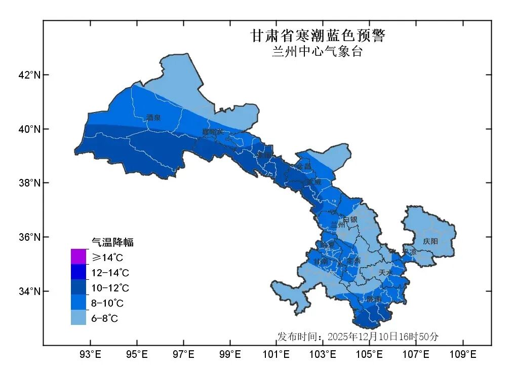 随着寒潮推进,我省大部气温将自西向东明显下降。其中,降温主要出现在11日至12日,其中河西五市、陇南等部分地方及陇中局部地方下降8~10℃,局地可达10℃以上,上述部分地方将出现寒潮。