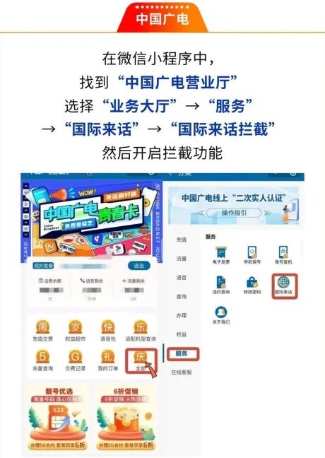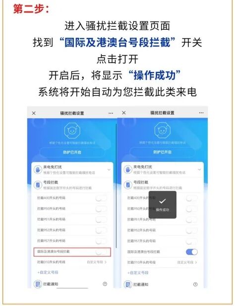 目前,移动、电信、联通和广电已经陆续开通了拦截境外来电业务,可通过几分钟的简单设置就可以进行拦截,从源头防范电信诈骗!
