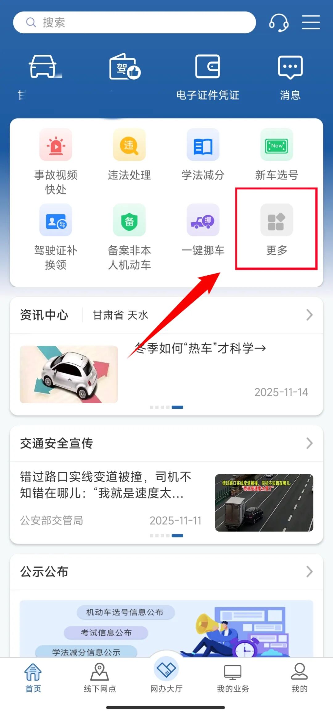 第一步:在手机下载登录“交管12123”APP,在首页中点击【更多】—【老年人业务代办】。