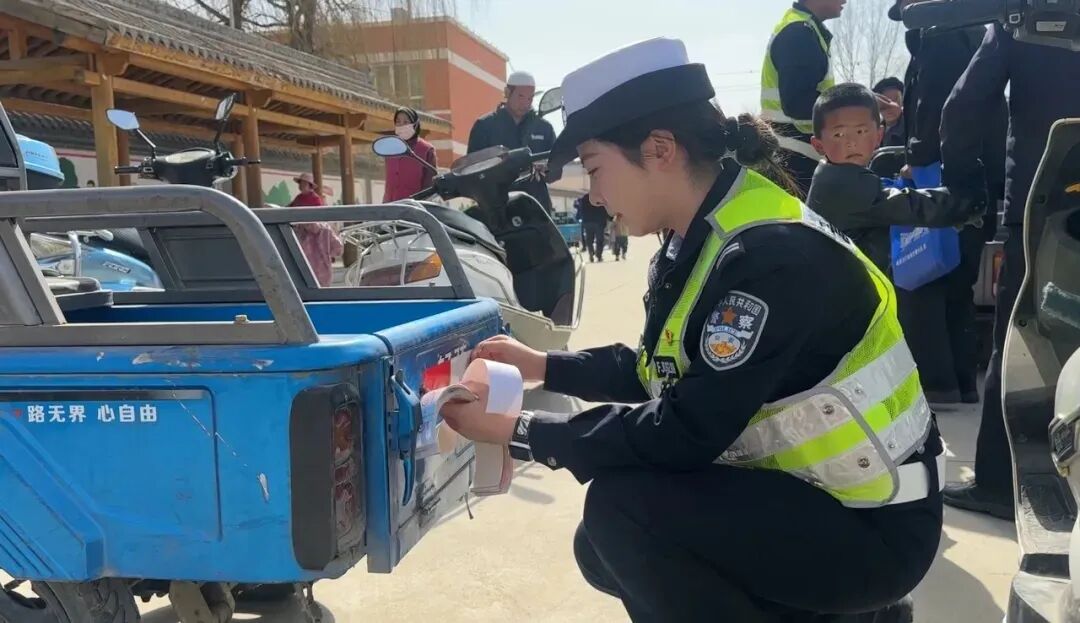 “师傅,您看这个案例,就是因为骑电动车没戴头盔,轻微碰撞就伤得不轻。”交警小马一边给过往村民递上宣传册,一边结合近期发生的农村道路交通事故案例,用通俗易懂的“大白话”讲解安全出行知识。针对集市上老年人骑三轮车、电动车出行多,家长带孩子赶集频繁的特点,交警们重点强调了头盔佩戴、不逆行、不超载、不闯红灯等关键注意事项,还现场演示了正确佩戴头盔的方法,手把手教村民给电动车粘贴反光贴,提醒大家夜间出行要注意灯光使用。