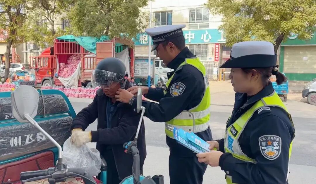 “大爷,骑三轮车出门可得把头盔戴好,这可是保命的‘安全帽’!”“大姐,赶集人多车杂,可不能逆行,也别带着孩子骑电动车闯红灯呀!”