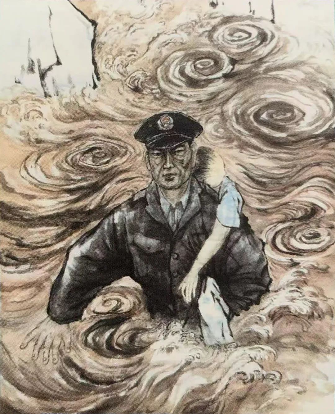 拿来绳索后,韩英抢先说:“你们都不会游泳,我游过去后你们把绳索扔过来。”说完,他便迅速脱下警服,义无反顾,奋不顾身,勇敢地跳入湍急的河流中,向河心岛游去。