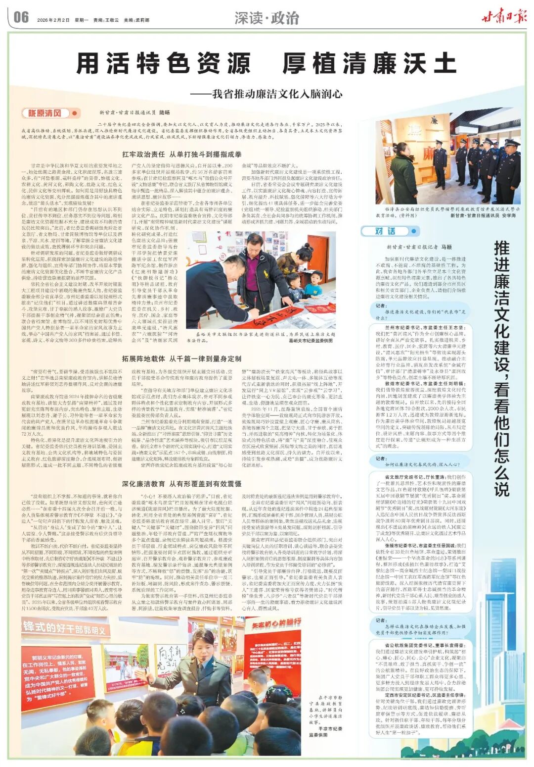兰州市纪委书记、市监委主任王志坚:我们把“黄河清风”作为全市创廉核心品牌,讲好全面从严治党故事。扎实推进机关、乡村、教育、医疗、国企、家庭等六大清廉单元建设,“清风惠农”“阳光招生”等做法实现源头防腐,单元品牌效应日益显现。推动融合主业培育行业品牌,涌现出发改系统“金诚有信”、审计部门“清廉铸审”及永登县“廉润玫乡”等特色亮点,创廉土壤不断培厚巩固。