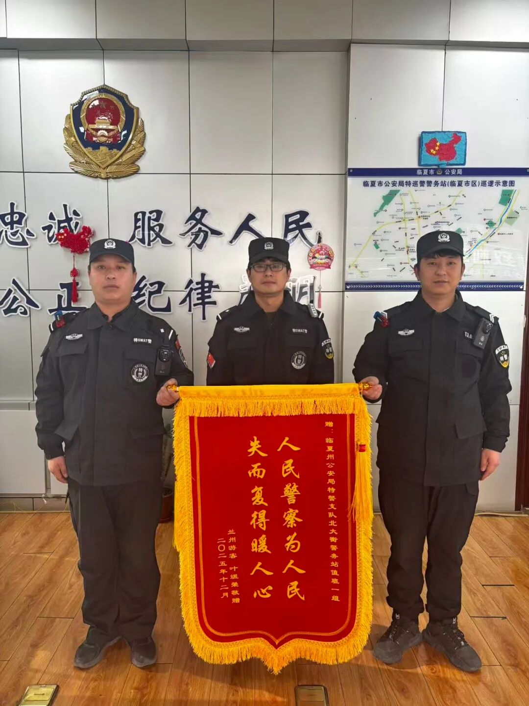不久后,临夏市北大街警务站收到了一面“远道而来”的印有“人民警察为人民,失而复得暖人心”锦旗,原来锦旗是兰州游客叶女士为感谢警务站巡逻组,让其不慎丢失的行李箱失而复得而专门邮寄来的。