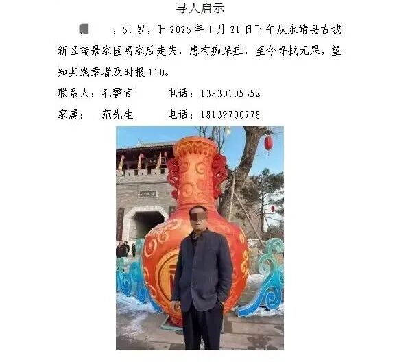 据悉,失联老人今年61岁,患有老年痴呆症,于1月21日从家中意外走失,家属连日来四处奔波寻找,走遍了周边街巷、村落,却始终没有老人的踪迹,在万般无奈之下,焦急向公安机关求助。