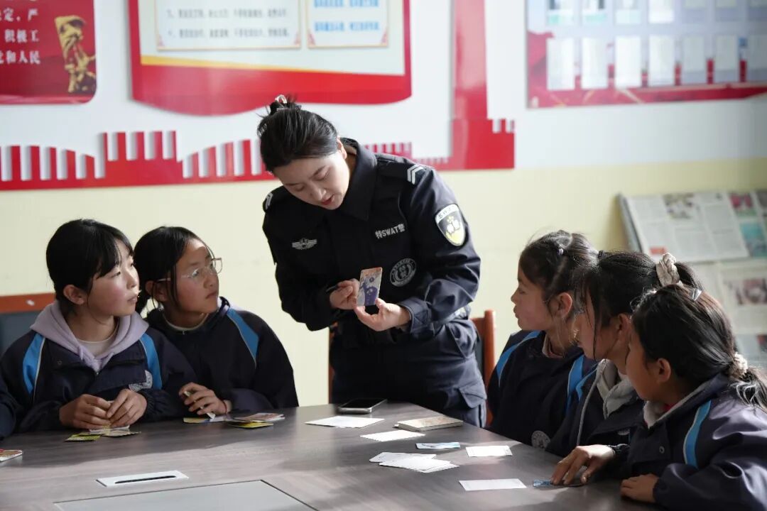“这是一幅欧卡牌,请同学们抽一张字牌和一张图牌,然后分享自己所看到和想到的内容……”在轻松的环境中,心理辅导民警引导学生通过游戏互动、情景模拟、放松训练等方式,学会正确面对压力、调节情绪、处理人际关系。民警也结合自身经历,分享应对挫折、自我保护的心得体会。一场场温暖的心理团辅,如春日暖阳般照进孩子们的心田,为他们健康成长注入“心”能量。