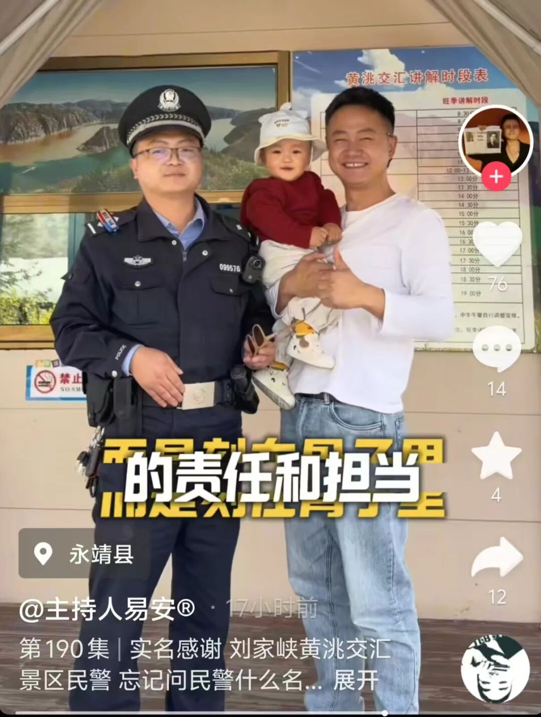 近日,永靖公安收到一名抖音用户@,该游客在网上发布的一条短视频,视频中,他带着妻儿到永靖县刘家峡黄洮交汇景区游玩,孩子的眼镜不慎掉入玻璃观景台下方的杂草中。于是抱着试一试的心态,向正在景区执勤的民警求助。没想到民警二话不说,前往观景台下方寻找。这份不求回报的暖心帮助,让游客深受感动,即便没记下民警的名字,也特意发布短视频实名致谢,用最朴素的话语,说出了群众对公安民警最真切的认可。